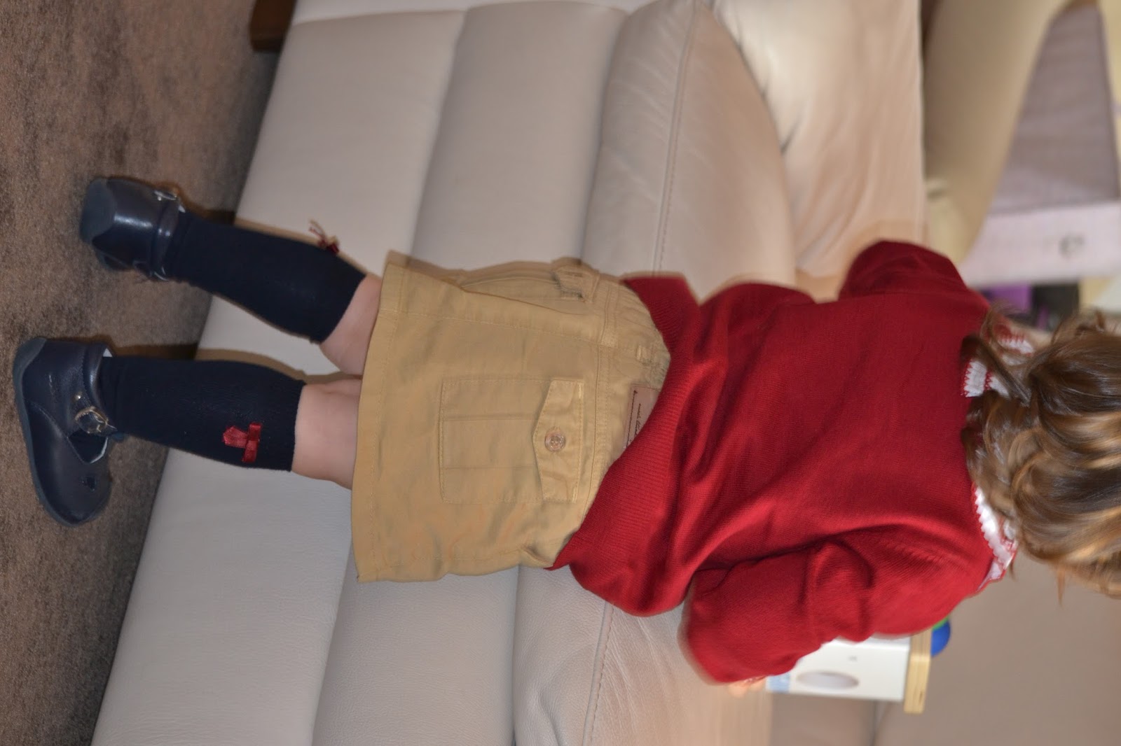 E menina mãe também se entreteve com um programa apetecível para dias como os que tivémos esta semana, de muita chuva. Ganhei coragem e pus mãos à roupa/costura! Aproveitei um dia para arrumar algumas roupas [guardar umas e dar outras] da Maria e dos papás. Ainda não tive coragem de guardar definitivamente algumas peças de Verão da Maria. De repente lembrei-me que ainda podiam ser úteis quando conjugadas com algumas peças da nova estação. Assim aconteceu com a saia da Knot da imagem que se segue. Demasiado curta para este tempo, mas com umas meias pelo joelho a coisa ainda vai dando para usar. Além de super giro aquece a pernoca. Para aproveitar os sapatos [que estão por dias ou não fosse a Maria queixar-se de vez em quando] personalizei as meias, colocando uns lacinhos bordeaux nas meias azuis [neste sapato e com esta roupa não imaginava outra cor...] e o resultado foi bastante satisfatório. Devo dizer que além das meias azuis e a pensar já em dar uso a outras peças [calções de ganga] personalizei umas cinza com laço rosa. Porquê laços? Porque sim, adoooooro!